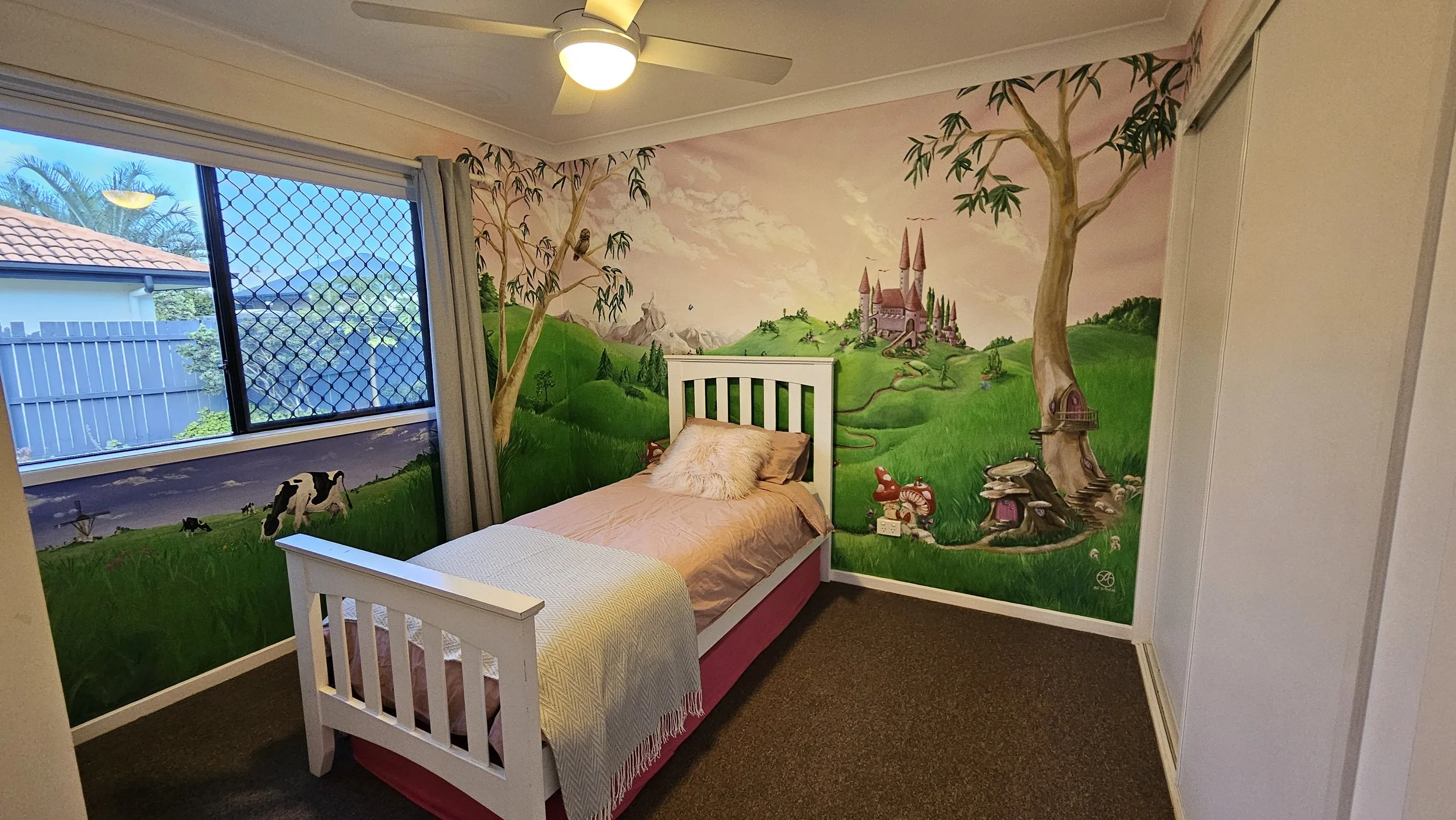 By day, a misty mountain range with snowy peaks stretches into the distance, creating depth beyond the walls. A grand castle sits on a hill overlooking meadowland. In one corner, a mature gum tree is painted as an optical illusion, dissolving the architecture and expanding the space. A tawny frogmouth watches quietly from its branches. Nearby, a winding stairwell wraps around another tree trunk, leading to a hidden fairy door. A tree stump forms a cosy home for imaginary fairies, while a kibbeling creek flows gently past. Along its bank, a troll house nestles into the landscape, its lantern glowing softly at night and casting warm light across the painted walls. Mushroom houses dot the meadow, and the mural wraps around corners, above the wardrobe, and into a narrow lead-in wall, guiding you visually into the scene as you enter the room.